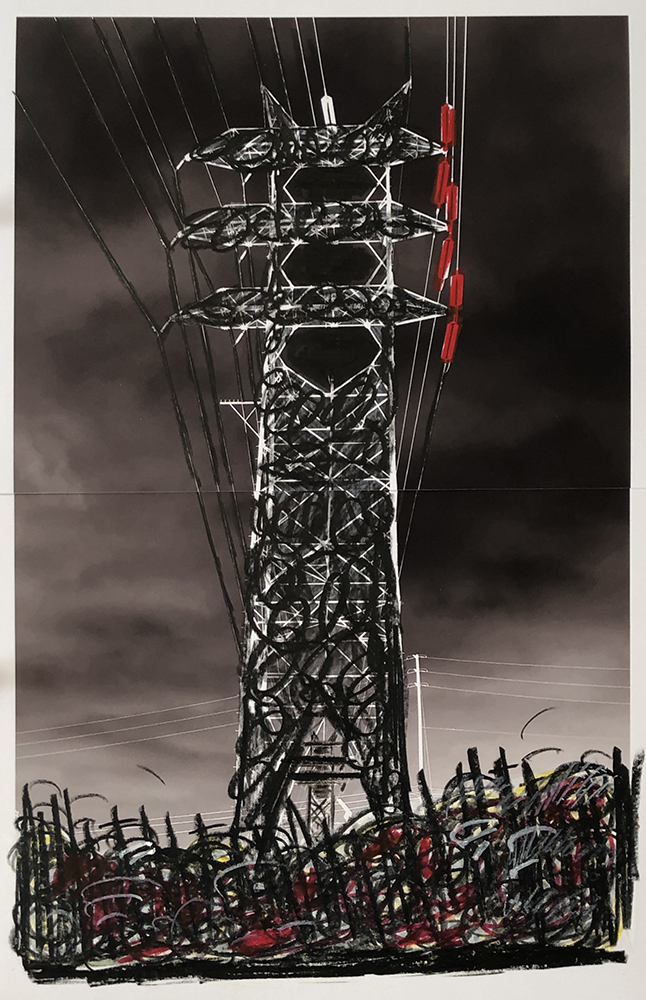 TOWER China markers on photographs of an electric transmission tower on the LA River in my neighborhood that I shot from 2015 to 2022. Direct and spontaneous, most were completed in one sitting. Pastoral to sci-fi to manga. 2022
